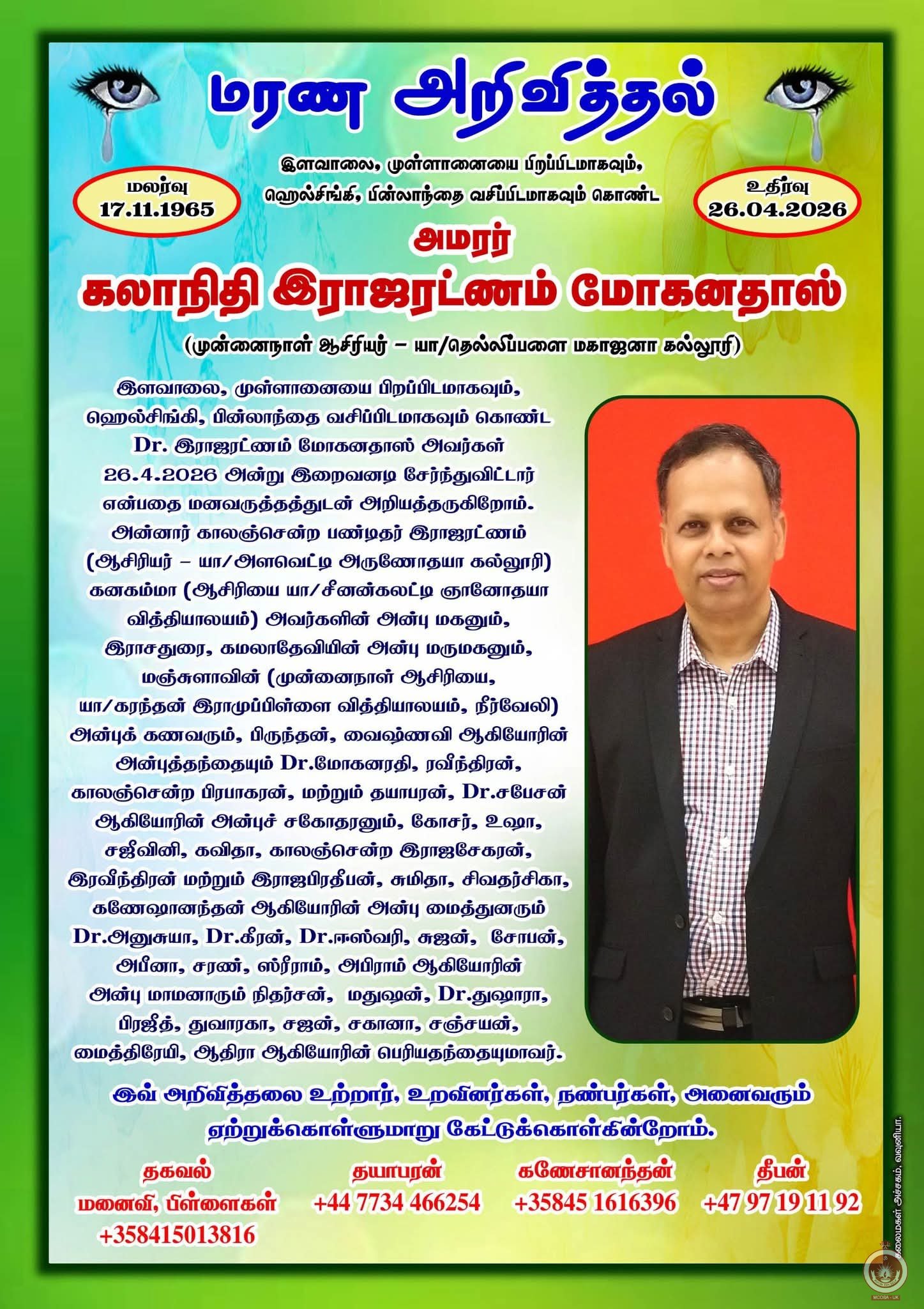 இளவாலை, முள்ளானையை பிறப்பிடமாகவும், ஹெல்சிங்கி, பின்லாந்தை வசிப்பிடமாகவும் கொண்ட Dr. இராஜரட்ணம் மோகனதாஸ் அவர்கள் 26.4.2026 அன்று இறைவனடி சேர்ந்துவிட்டார் என்பதை மனவருத்தத்துடன் அறியத்தருகிறோம்.