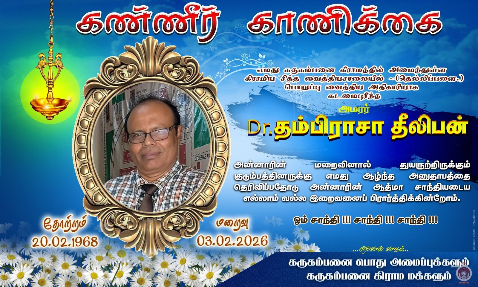அளவெட்டி மாசியப்பிட்டியை பிறப்பிடமாகவும், தெல்லிப்பளை பண்டத்தரிப்பு பிரதான வீதியை வசிப்பிடமாகவும் கொண்ட மருத்துவர் தம்பிராஜா திலீபன் (தெல்லிப்பளை மகாஜனாக்கல்லூரியின் பழைய மாணவன் 1984 .க.பொ.த (ச/த), 1987 க.பொ.த (உ/த), கீரிமலை சித்த ஆயுள்வேத வைத்தியசாலை பெறுப்பதிகாரி, முன்னாள் கைதடி யாழ் பல்கலைக்கழக சித்த மருத்துவத்துறை விரிவுரையாளர், பன்டத்தரிப்பு சித்த ஆயுள்வேத வைத்தியசாலை பொறுப்பதிகாரி, கைதடி ஆயுள்வேத வைத்தியசாலை பொறுப்பதிகாரி) இன்று 03-02-2026 காலமானார்.