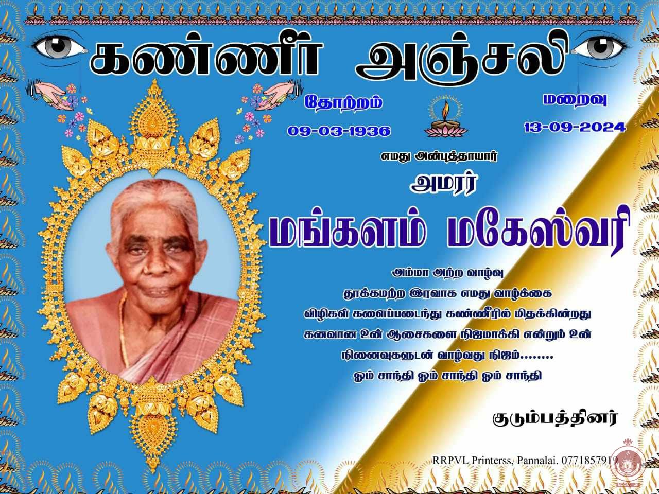 மகாஜனக் கல்லூரி முன்னாள் அதிபர் மணிசேகரனின் தாயார் திருமதி. மகேஸ்வரி மங்களம் அவர்கள் 13/09/2024 அன்று காலமானார்.