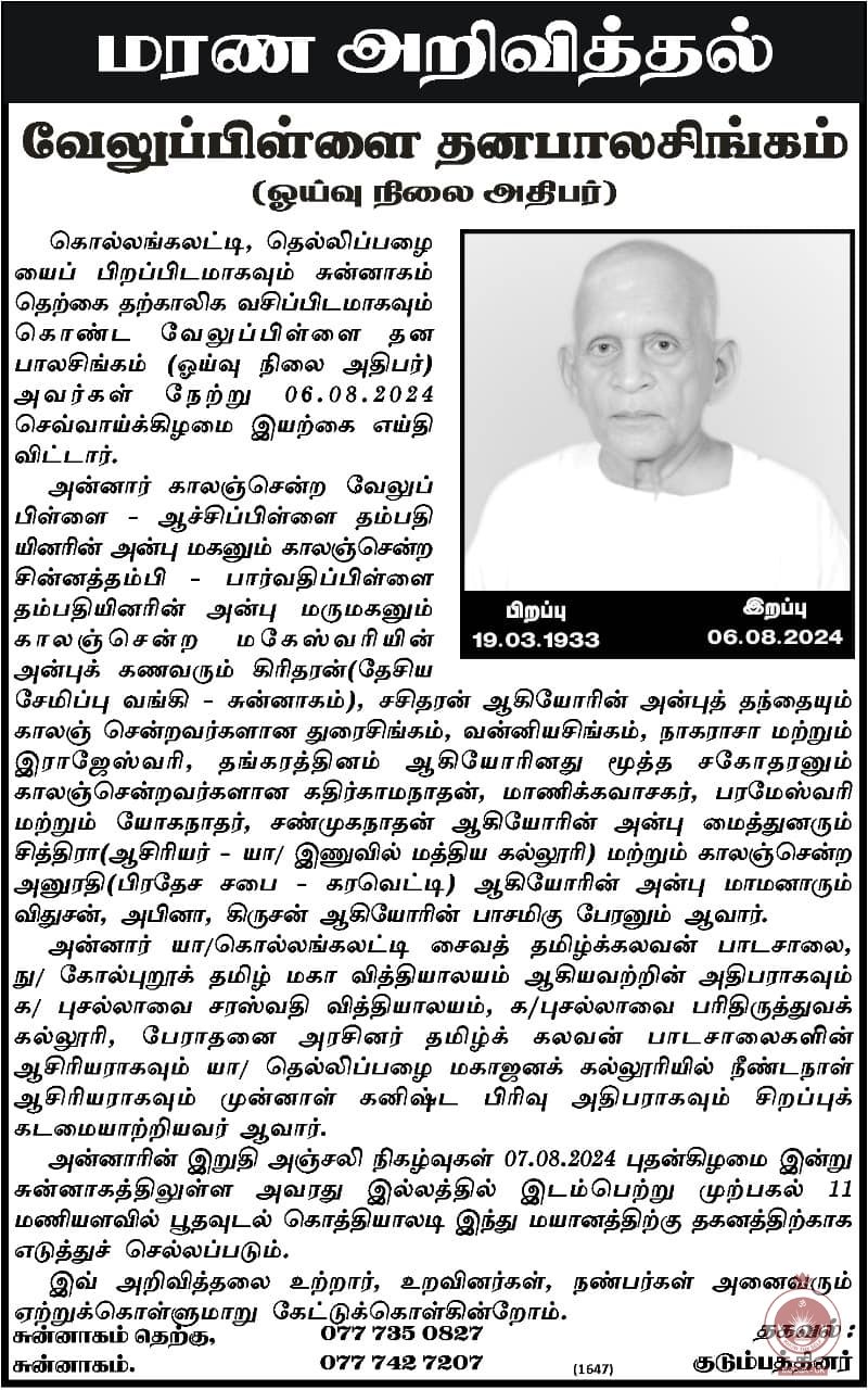 மகாஜனக் கல்லூரியின் முன்னாள் கனிஸ்ட பாடசாலை அதிபரும், நீண்டநாள் ஆசிரியருமான திரு. வேலுப்பிள்ளை தனபாலசிங்கம் அவர்கள் 06/08/2024 அன்று அன்னாரின் சுன்னாக இல்லத்தில் காலமானார்.