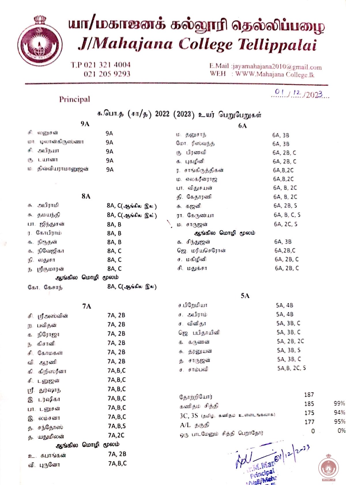 இன்று வெளியிடப்பட்டுள்ள 2022 ஆம் ஆண்டுக்கான கல்வி பொதுத் தராதர சாதாரண தரப்பரீட்சையில் மகாஜனக் கல்லூரி மாணவர்கள் பெற்ற பெறுபேறுகள்.