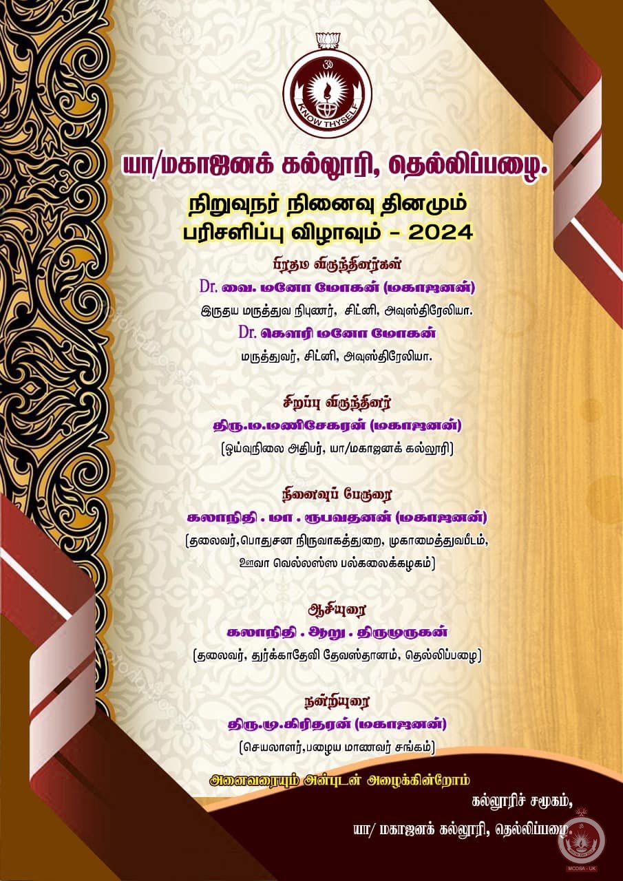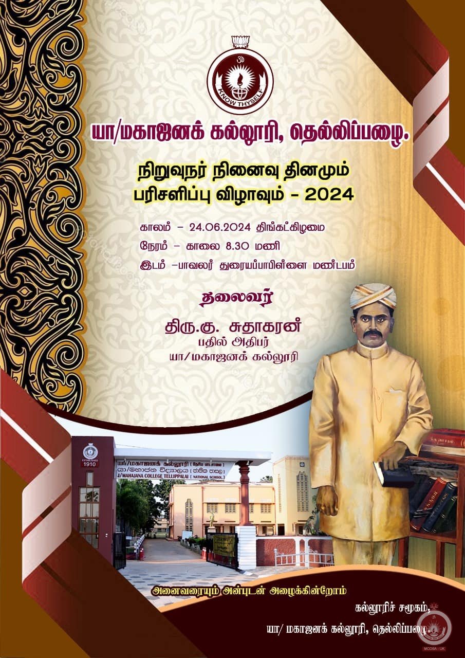 மகாஜன கல்லூரியில் 24-06-2024 திங்கட்கிழமை காலை 8:30 மணிக்கு நிறுவுநர் நினைவு தினமும் பரிசளிப்பு விழாவும் நடைபெறவுள்ளது.