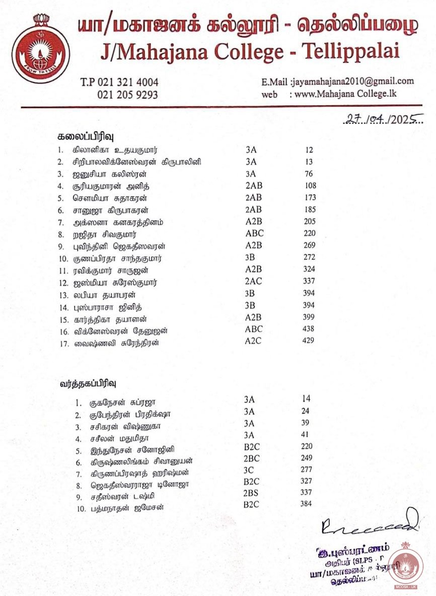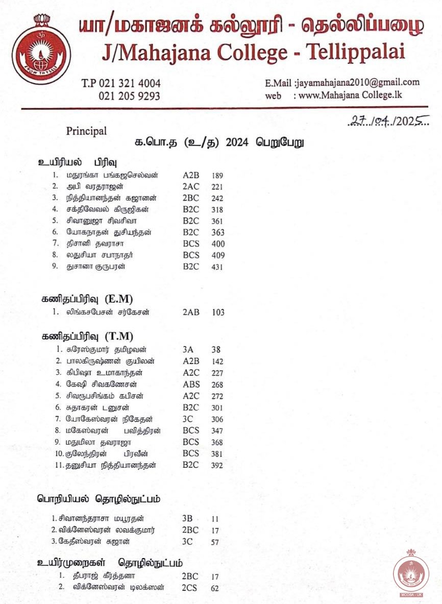 மகாஜனக் கல்லூரி மாணவர்களின் 2024 க.பொ.த உயர்தர பெறுபேறுகள்