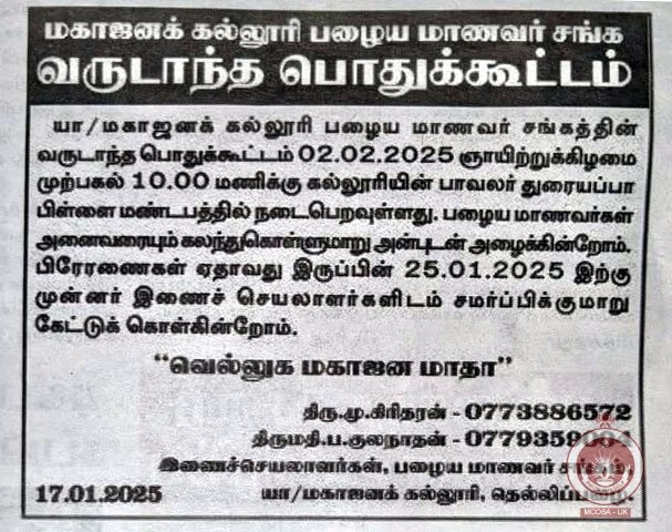 மகாஜனக்கல்லூரி பழைய மாணவர் சங்க வருடாந்த பொதுக்கூட்டம் 2025