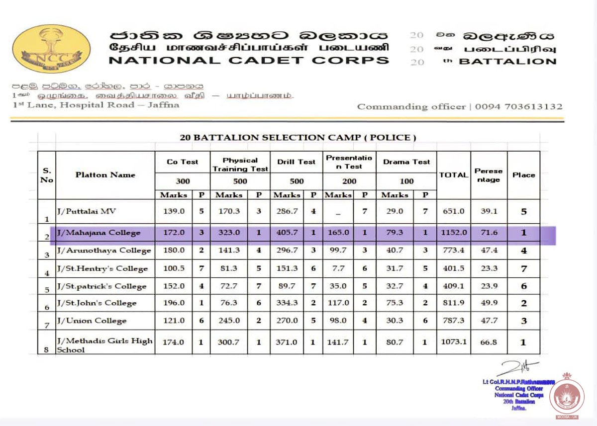 யா/ மத்திய கல்லூரியில் 25-06-2025 அன்று இடம்பெற்ற மாவட்ட மட்ட பொலிஸ் கடேட் போட்டியில் 20ஆவது படைப்பிரிவின் மாணவர் பொலிஸ் படைப்பிரிவில் மகாஜனக் கல்லூரி முதலாம் இடத்தை அதி கூடிய புள்ளிகள் வேறுபாட்டால் வெற்றியீட்டியதோடு தொடர்ச்சியாக நான்காவது முறையாக வெற்றியீட்டியமை குறிப்பிடதக்கது.
