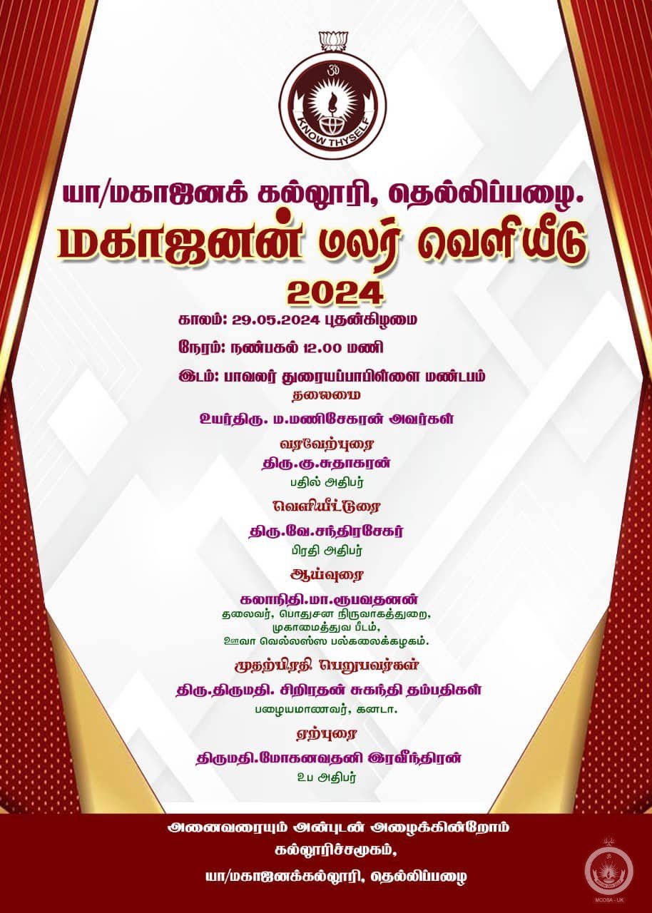 மகாஜனக் கல்லூரியின் வரலாற்றையும் சாதனைகளையும் தாங்கிவரும் ”மகாஜனன்” மலர் 29.05.2024 புதன்கிழமை மதியம் 12.00 மணிக்கு வெளியிடப்படவுள்ளது. 2019 தொடக்கம் 2023 வரையான காலப்பகுதியை உள்ளடக்கியதாக இம்மலர் வெளிவருகின்றது.
