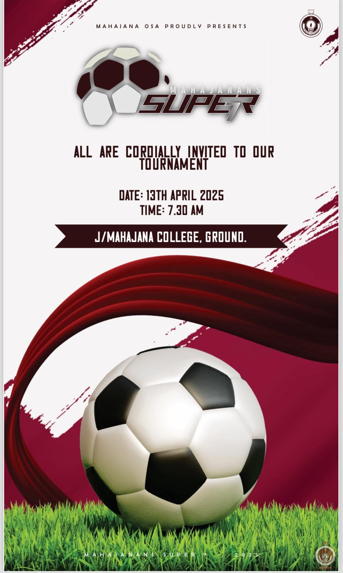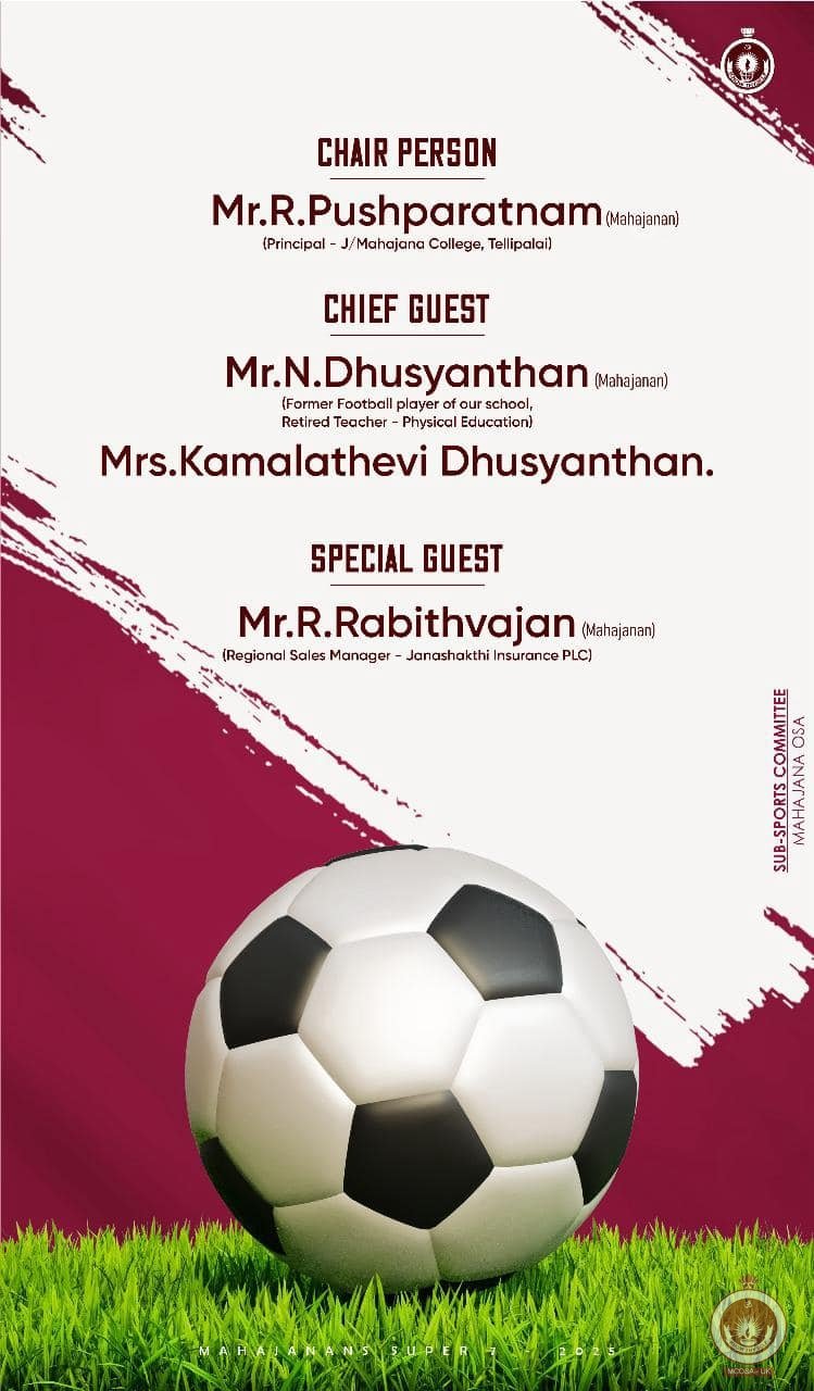பழைய மாணவர் சங்கம் நடாத்தும் MAHAJANANS SUPER 7 உதைபந்தாட்ட போட்டி எதிர்வரும் 13.04.2025 ஆம் திகதி ஞாயிற்றுக்கிழமை நடைபெறவுள்ளது.
