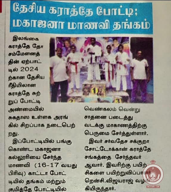 இலங்கை கராத்தே சம்மேளனம் தேசியமட்டத்தில் நடாத்திய கராத்தே போட்டியில் எமது கல்லூரி மாணவி ஐங்கரன் மிஷாயினி தங்கம், வெண்கலம் என இரு பதக்கங்களைப் பெற்றுள்ளார்.