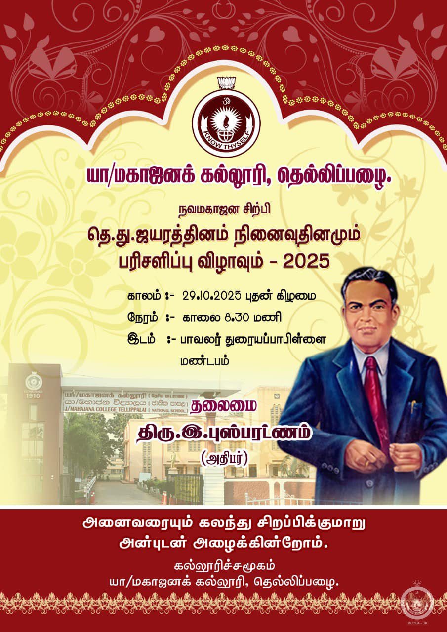 நாளை 29.10.2025 புதன்கிழமை மகாஜன சிற்பி ஜயரத்தினம் நினைவுதினமும் பரிசளிப்பு விழாவும்.