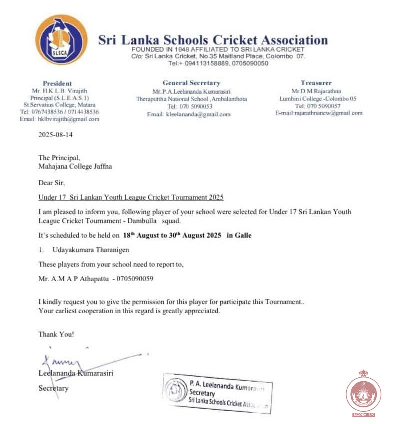 17 வயதிற்குட்பட்ட தம்புள்ள சுப்பர் மாகாண துடுப்பாட்ட அணிக்கு எமது கல்லூரி மாணவன் உதயகுமார் தரணிகன் தெரிவுசெய்யப்பட்டுள்ளார்.